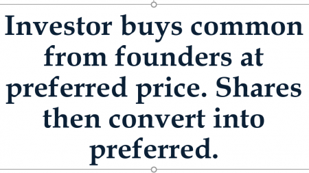 The following method for providing founders liquidity has been very popular during the last three years: An investor buys common stock from founders during a preferred financing at the preferred price. Those same common shares are then magically exchanged by the investor with the company for the most recent class of preferred shares, which is what the investor really wanted the whole time.